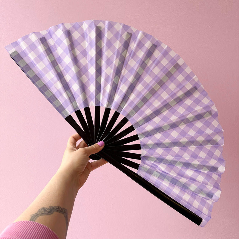 Giant Clacking Hand Fan with Lilac Gingham print (Glows in UV!)