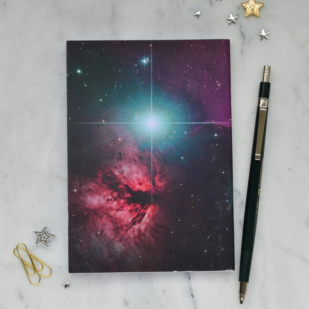 The ’Pink & Turquoise Nebula’ notebooks feature star sparkles on page corners and a moon phase print on the inside covers. A panoramic view of the nebula can be seen across the front to back covers.