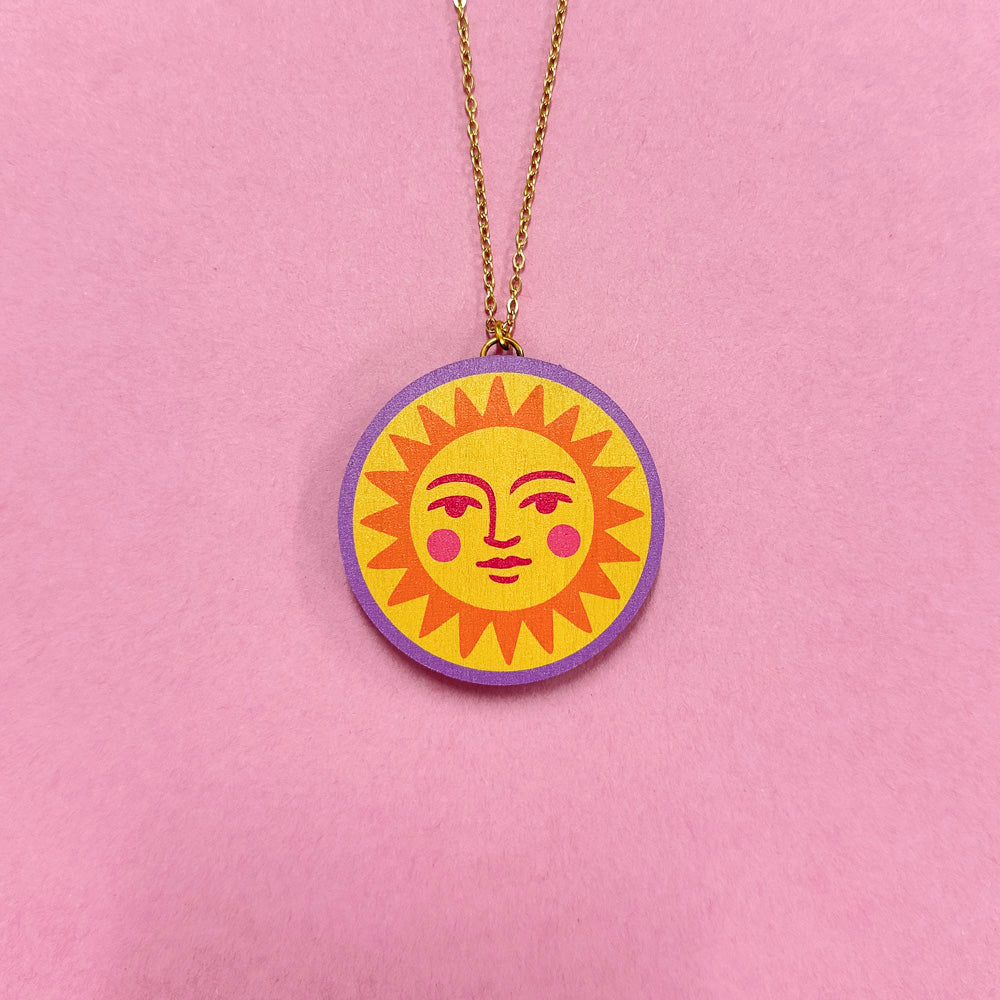 The celestial design is printed onto lightweight wood for comfortable all-day-long wear, hanging on a delicate gold-plated surgical steel chain. Pick your favourite, or switch from Sun to Moon when night falls - the choice is yours